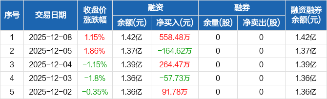 捷邦科技:融资净买入558.48万元,融资余额1.42亿元(12-08)