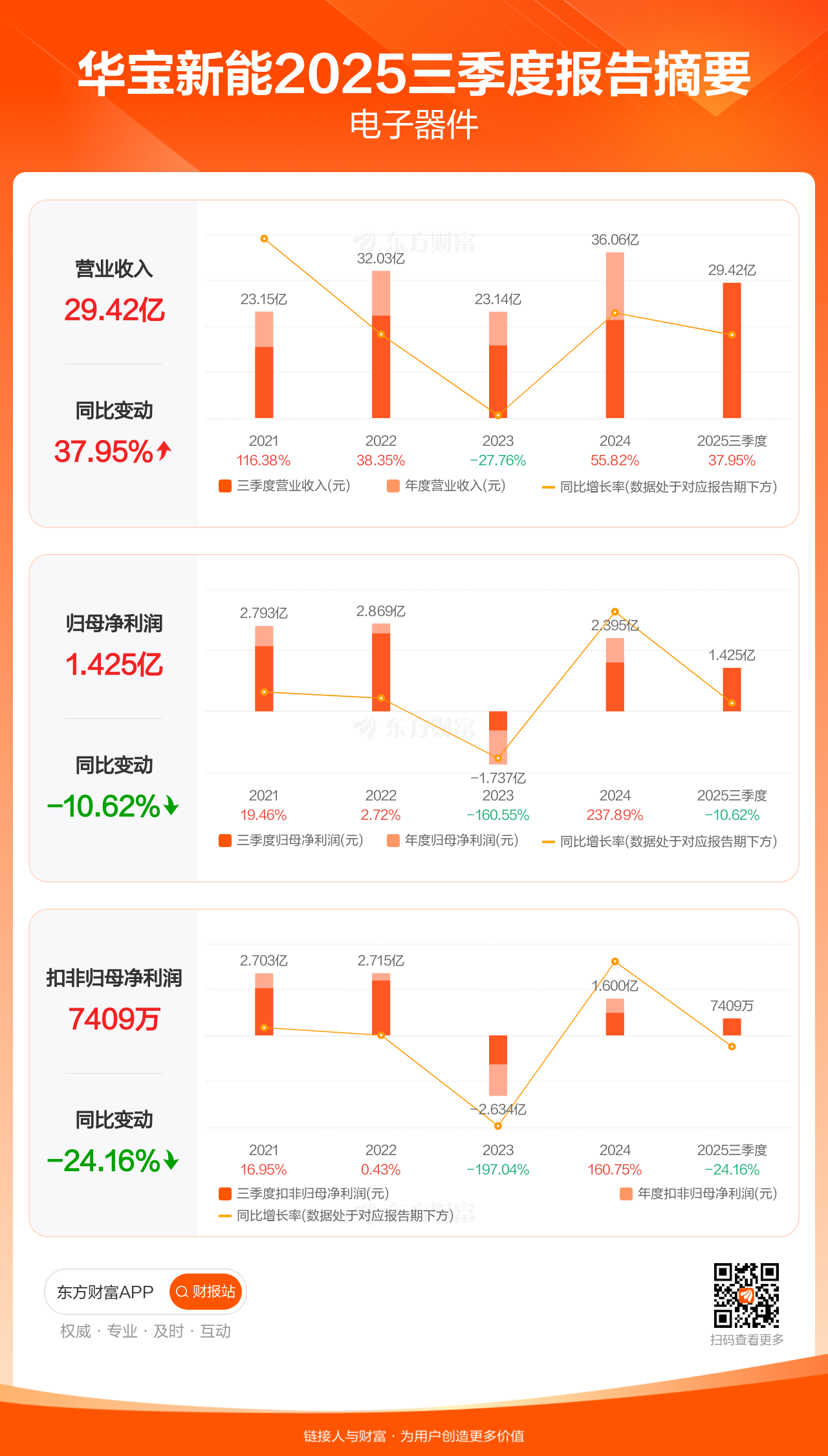 华宝新能10月29日发布2025年三季报显示,公司前三季实现营业收入29.42亿元,同比增长37.95%;归母净利润1.43亿元,同比下滑10.62%;扣非归母净利润7408.98万元,同比下滑24.16%。