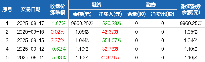 诺思格:融资净偿还520.28万元,融资余额9960.25万元(09-17)