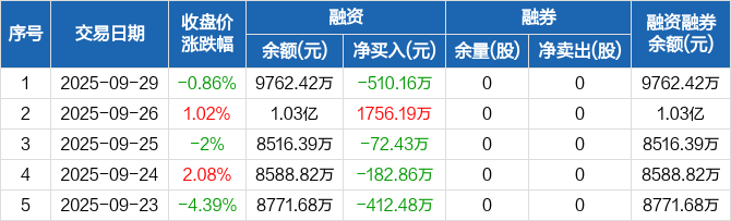 诺思格:融资净偿还510.16万元,融资余额9762.42万元(09-29)