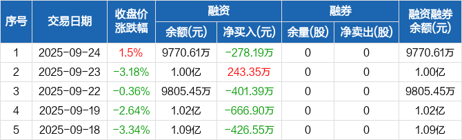 信德新材:融资净偿还278.19万元,融资余额9770.61万元(09-24)