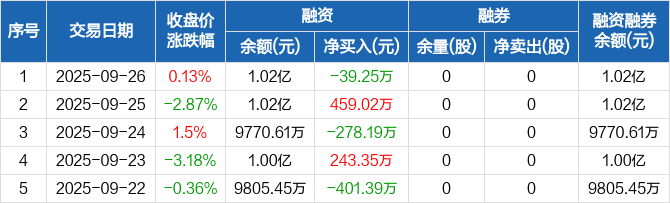 信德新材:融资净偿还39.25万元,融资余额1.02亿元(09-26)