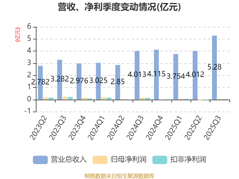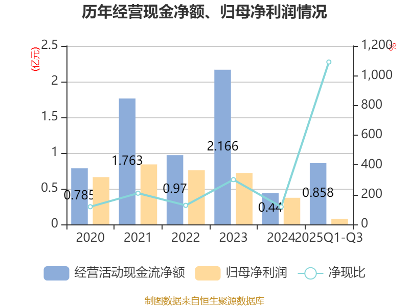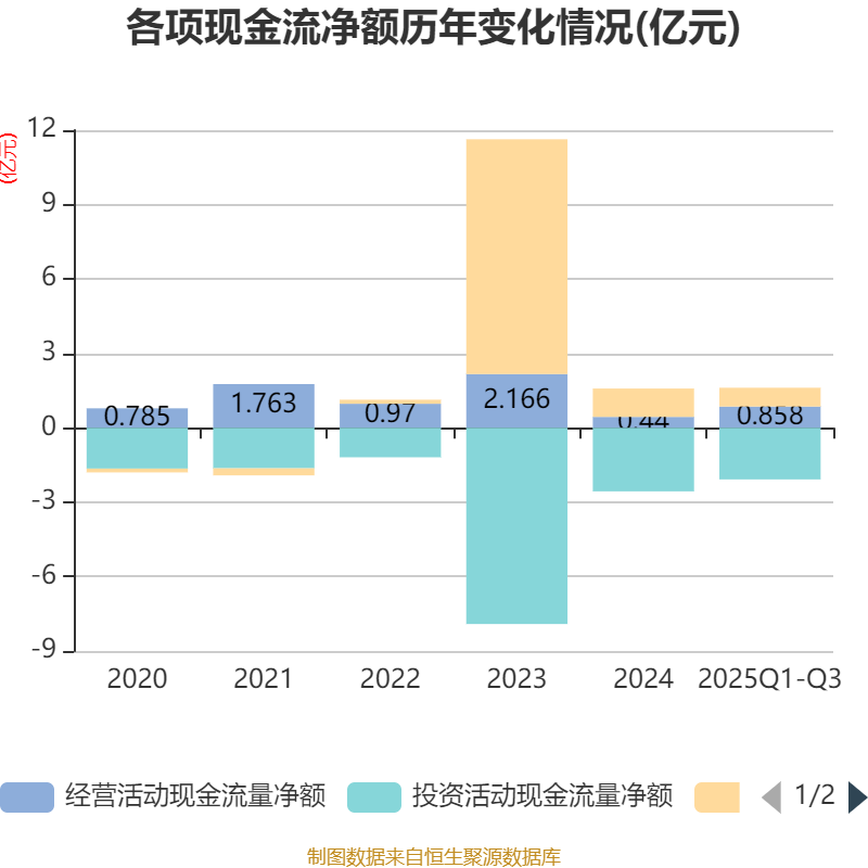 2025年前三季度,公司经营活动现金流净额为8579.67万元,同比增长9.6%;筹资活动现金流净额7569.67万元,同比增加5640.89万元;投资活动现金流净额-2.08亿元,上年同期为-4413.85万元。