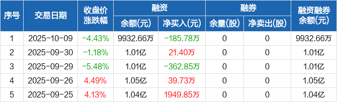 天振股份:融资净偿还185.78万元,融资余额9932.66万元(10-09)