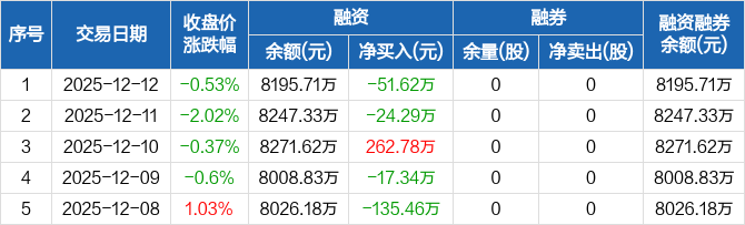天振股份:融资净偿还51.62万元,融资余额8195.71万元(12-12)