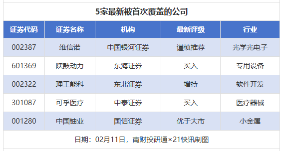 首次覆盖方面,2月11日券商共给出了5次首次覆盖,其中维信诺获得中国银河证券给予“谨慎推荐”评级,陕鼓动力获得东海证券给予“买入”评级,理工能科获得东北证券给予“增持”评级,可孚医疗获得中泰证券给予“买入”评级,中国铀业获得国信证券给予“优于大市”评级。