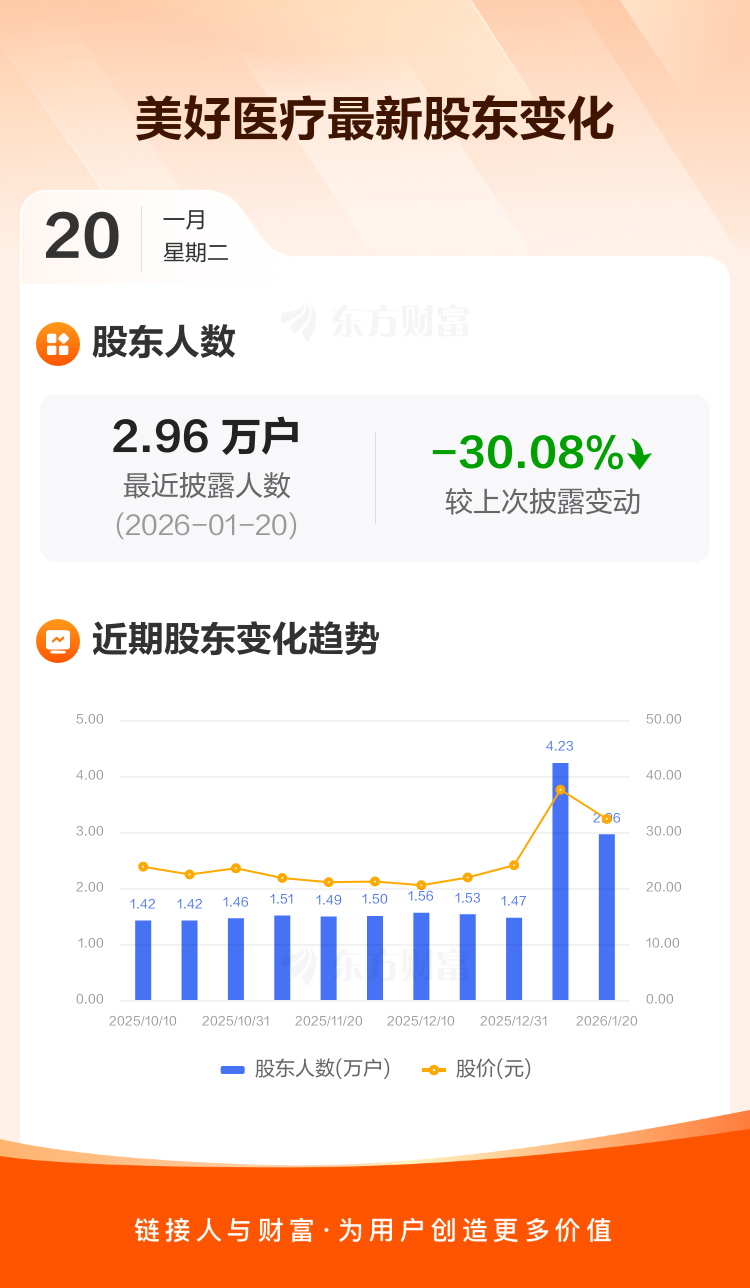 美好医疗:截至1月20日最新股东户数2.96万户,较上期减少30.08%