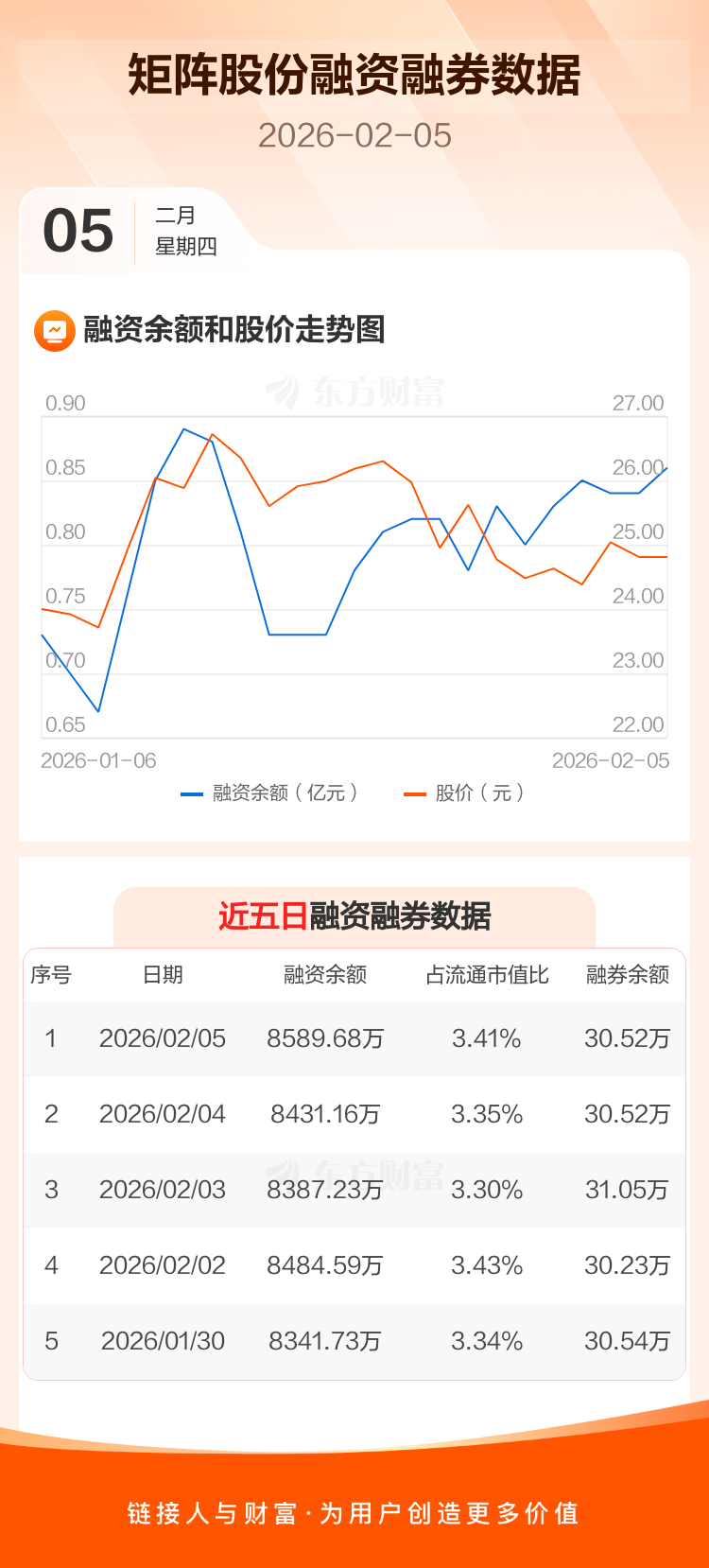 交易所最新数据显示,矩阵股份于2026年2月5日获融资买入457.08万元,融资偿还298.55万元,当日融资净买入158.52万元。目前,该股融资余额8589.68万,占流通市值比例为3.41%。
