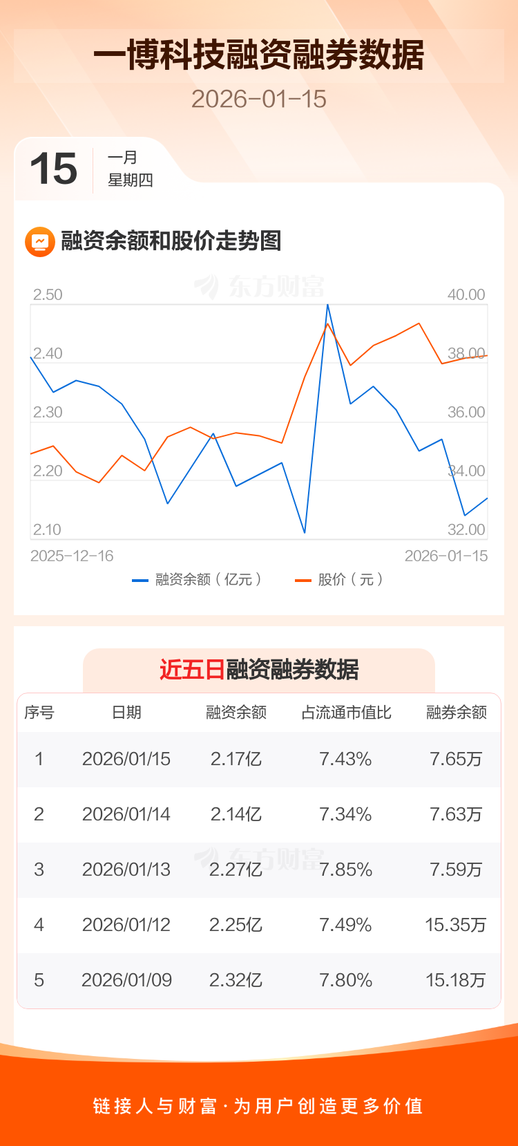 交易所最新数据显示,一博科技于2026年1月15日获融资买入1934.27万元,融资偿还1640.21万元,当日融资净买入294.06万元。目前,该股融资余额2.17亿,占流通市值比例为7.43%。