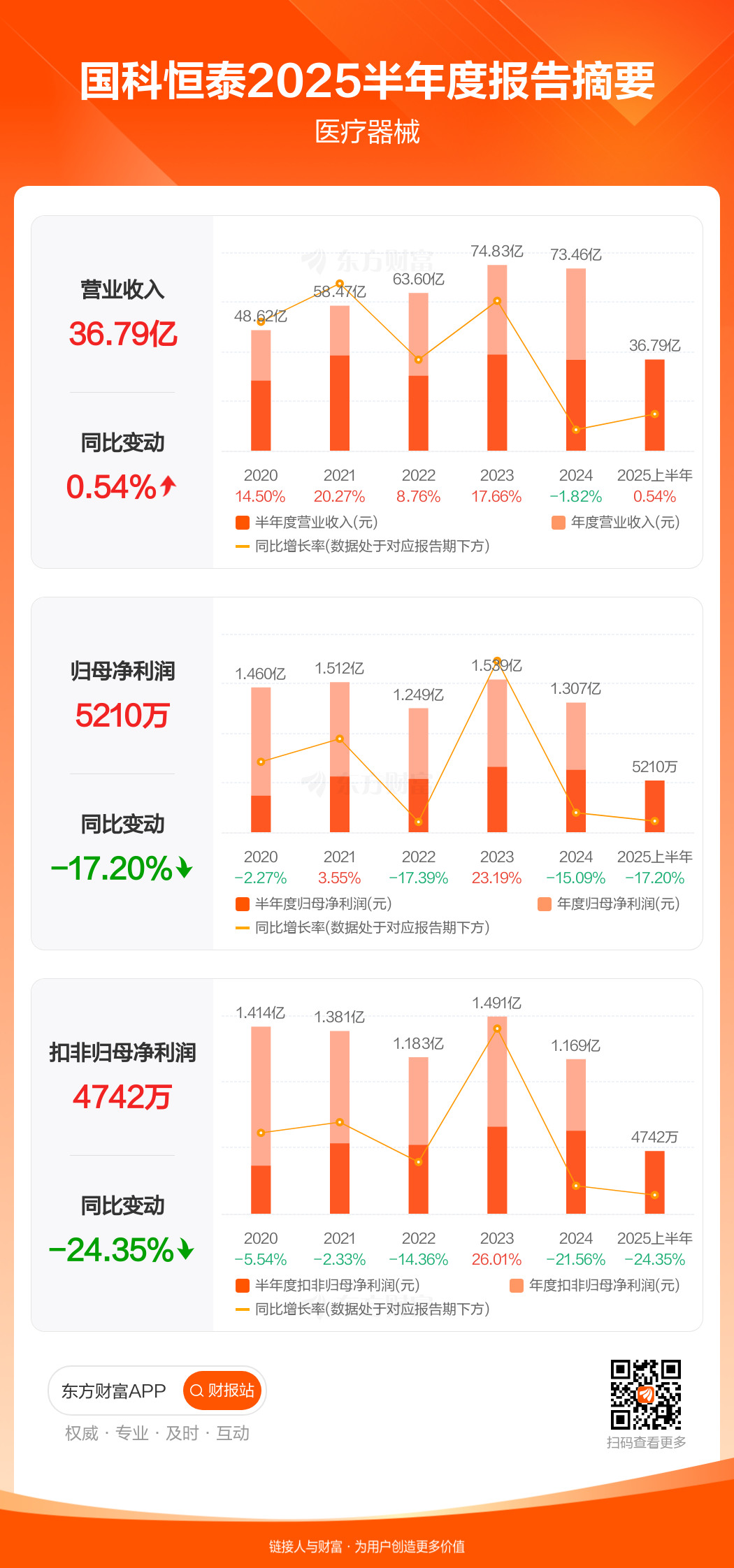 国科恒泰发布2025半年度报告显示,公司上半年实现营业收入36.79亿元,同比增长0.54%;归母净利润5209.54万元,同比下滑17.20%;扣非归母净利润4741.71万元,同比下滑24.35%。