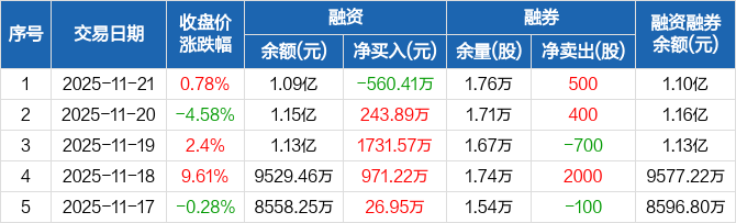 融资方面,当日融资买入3384.7万元,融资偿还3945.11万元,融资净偿还560.41万元。融券方面,融券卖出500股,融券偿还0股,融券余量1.76万股,融券余额47.57万元。融资融券余额合计1.1亿元。