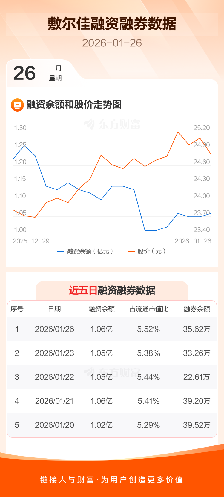 交易所最新数据显示,敷尔佳于2026年1月26日获融资买入639.32万元,融资偿还494.74万元,当日融资净买入144.58万元。目前,该股融资余额1.06亿,占流通市值比例为5.52%。