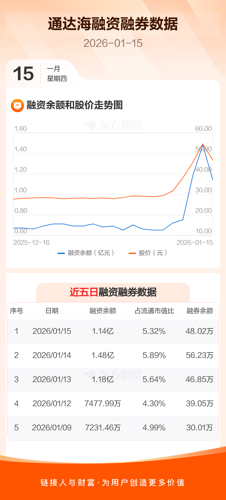 交易所最新数据显示,通达海于2026年1月15日获融资买入6273.66万元,融资偿还9645.75万元,当日融资净偿还3372.09万元。目前,该股融资余额1.14亿,占流通市值比例为5.32%。