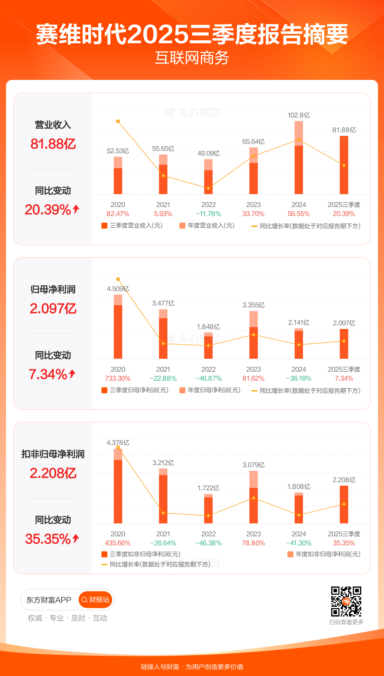 赛维时代10月29日发布2025年三季报显示,公司前三季实现营业收入81.88亿元,同比增长20.39%;归母净利润2.10亿元,同比增长7.34%;扣非归母净利润2.21亿元,同比增长35.35%。