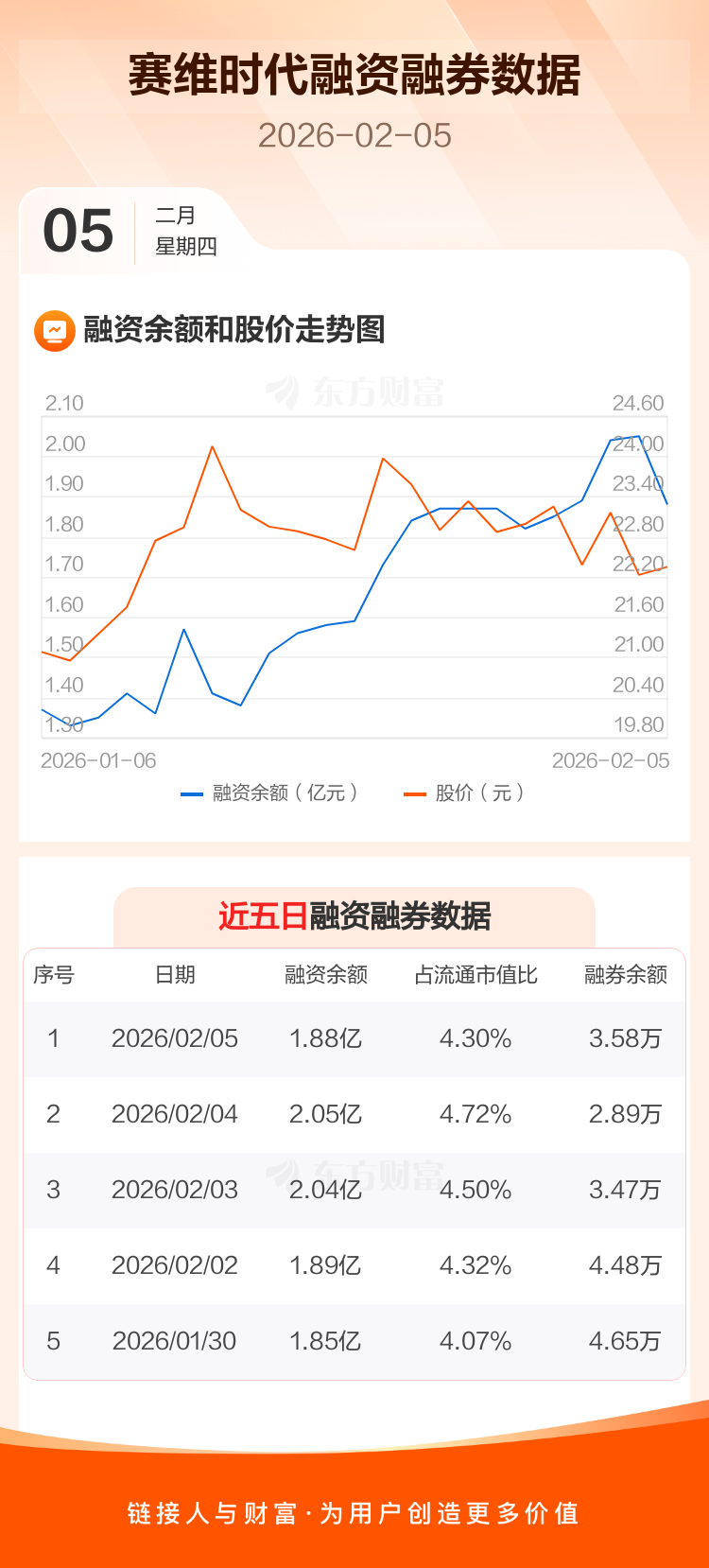 交易所最新数据显示,赛维时代于2026年2月5日获融资买入574.01万元,融资偿还2296.45万元,当日融资净偿还1722.44万元。目前,该股融资余额1.88亿,占流通市值比例为4.30%。
