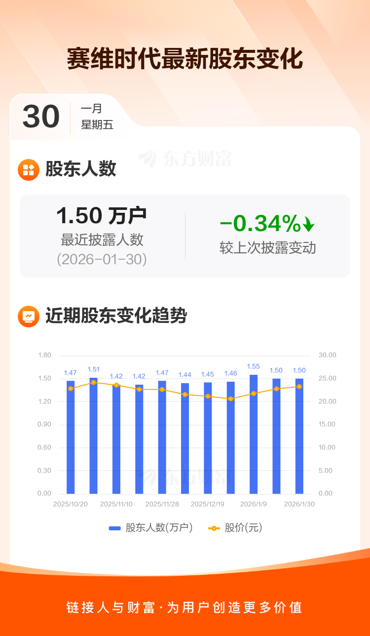 赛维时代最新披露数据显示,截至1月30日公司股东户数为1.50万户,较上期(2026年1月20日)减少51户,降幅为0.34%。户均持有流通股数量由上期的1.30万股上升至1.31万股,户均持股金额由上期的29.66万元增加至30.40万元。