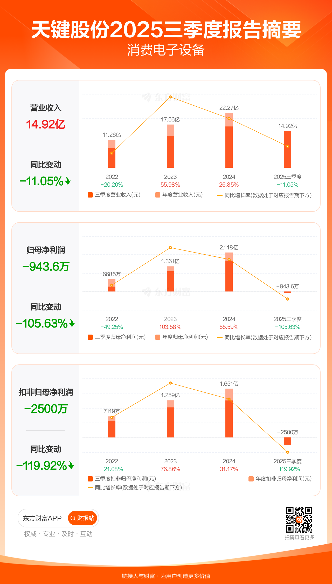 图解财报:天键股份前三季归母净利润-943.60万元,上年同期1.68亿元