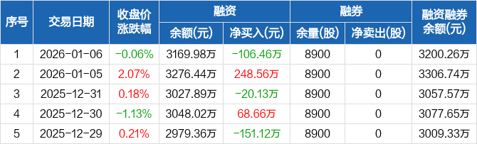 经纬股份:融资净偿还106.46万元,融资余额3169.98万元(01-06)