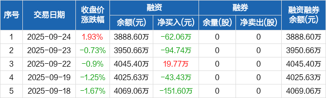 仁信新材:融资净偿还62.06万元,融资余额3888.6万元(09-24)