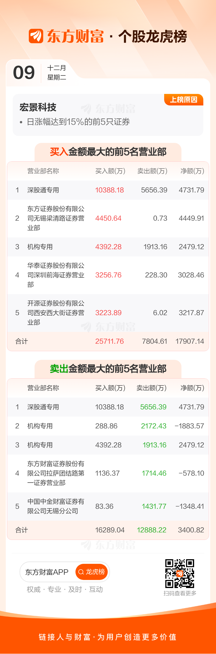 交易所2025年12月9日公布的交易公开信息显示,宏景科技因成为日涨幅达到15%的前5只证券上榜。宏景科技当日收报71.56元,涨跌幅16.99%,偏离值16.99%,换手率34.78%,成交额18.20亿。