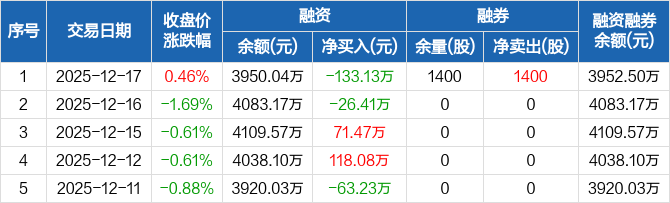 英特科技:融资净偿还133.13万元,融资余额3950.04万元(12-17)