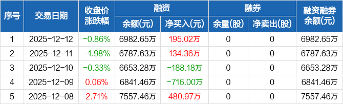 阿莱德:融资净买入195.02万元,融资余额6982.65万元(12-12)