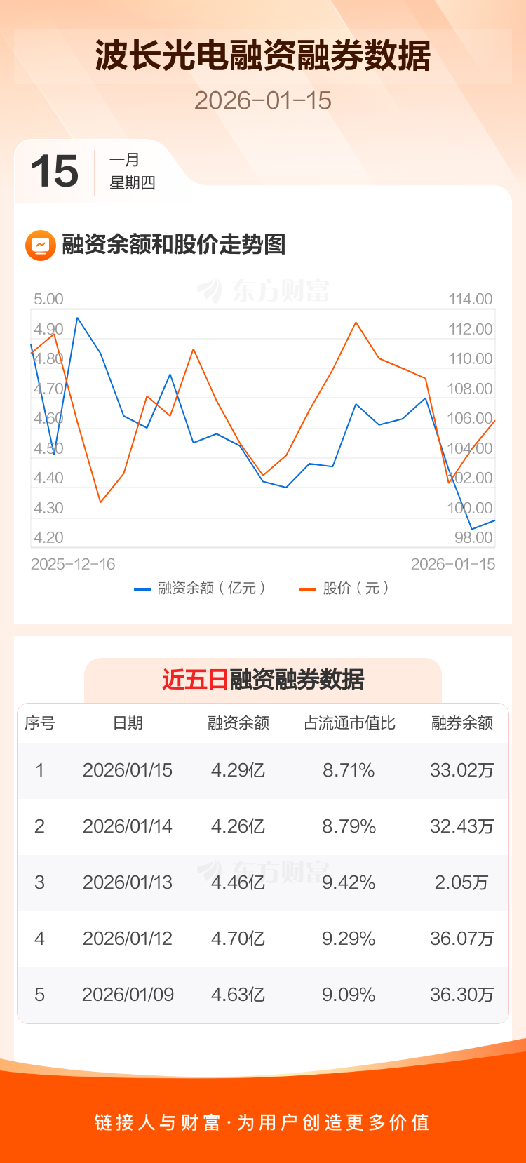 交易所最新数据显示,波长光电于2026年1月15日获融资买入6401.88万元,融资偿还6039.73万元,当日融资净买入362.15万元。目前,该股融资余额4.29亿,占流通市值比例为8.71%。