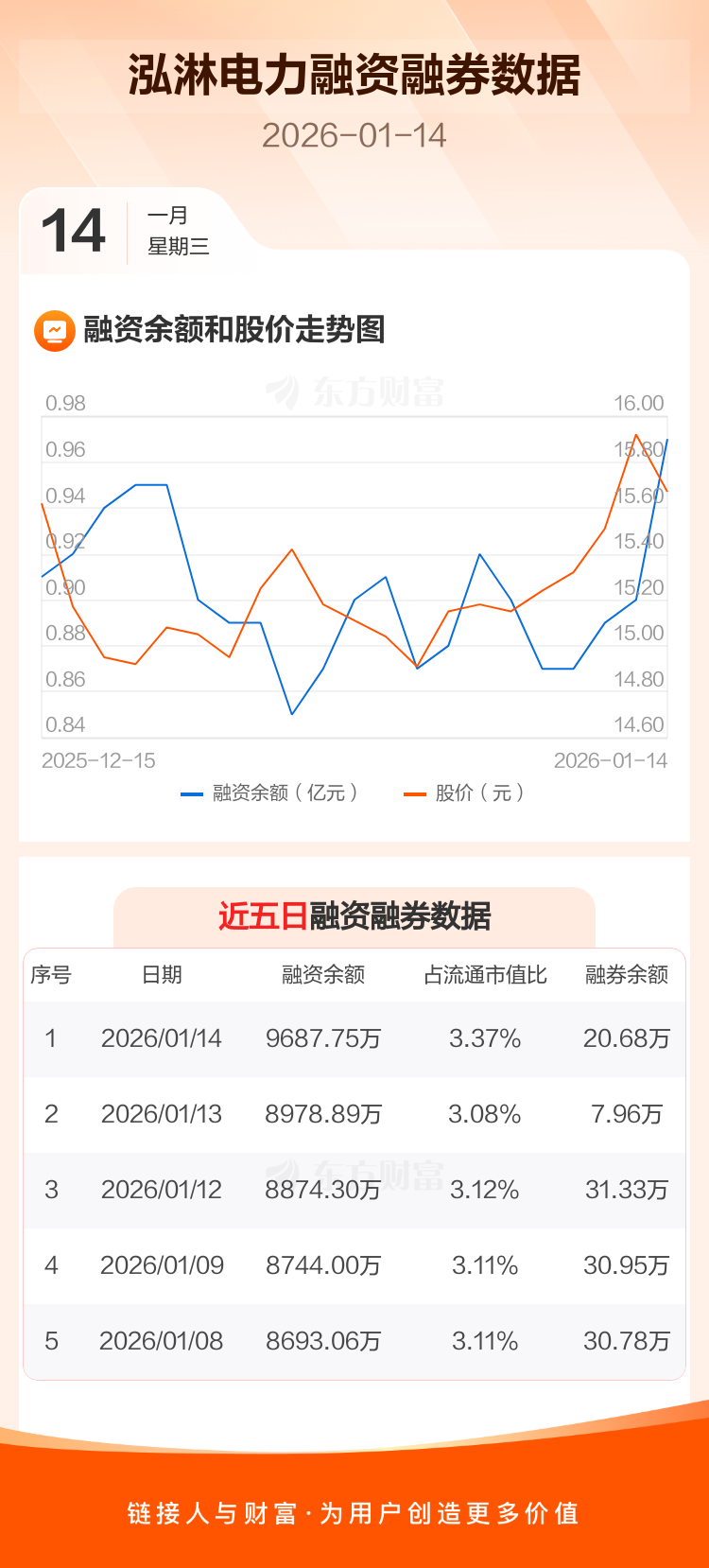 交易所最新数据显示,泓淋电力于2026年1月14日获融资买入2163.51万元,融资偿还1454.65万元,当日融资净买入708.86万元。目前,该股融资余额9687.75万,占流通市值比例为3.37%。
