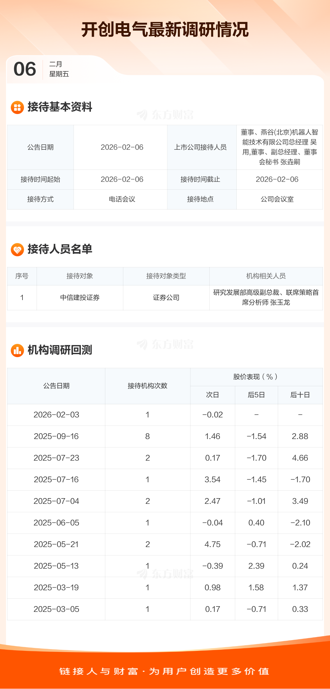 开创电气2月6日公告称,2月6日接待中信建投证券等1家机构调研。接待人员包括董事、燕谷(北京)机器人智能技术有限公司总经理 吴用,董事、副总经理、董事会秘书 张垚嗣。