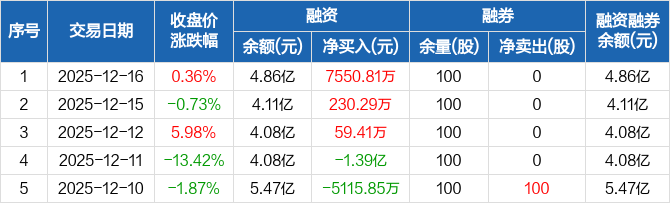 融资方面,当日融资买入2.31亿元,融资偿还1.55亿元,融资净买入7550.81万元,连续3日净买入累计7840.5万元。融券方面,融券卖出0股,融券偿还0股,融券余量100股,融券余额1.09万元。融资融券余额合计4.86亿元。