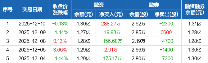 飞南资源:融资净买入288.27万元,融资余额1.3亿元(12-10)