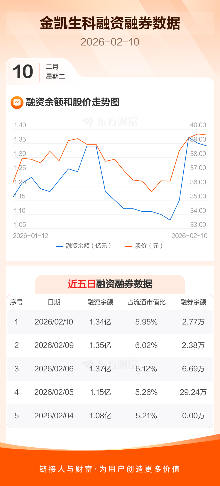 交易所最新数据显示,金凯生科于2026年2月10日获融资买入1435.30万元,融资偿还1602.44万元,当日融资净偿还167.14万元。目前,该股融资余额1.34亿,占流通市值比例为5.95%。