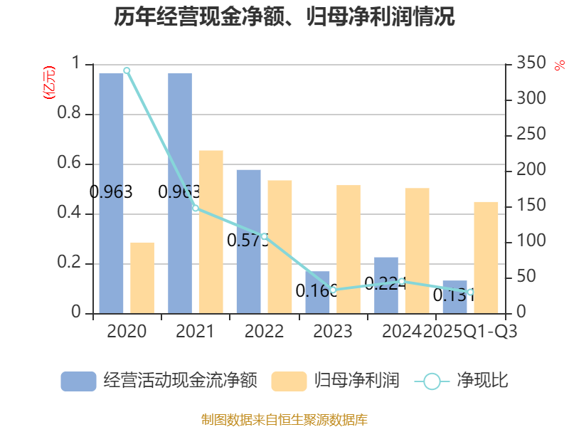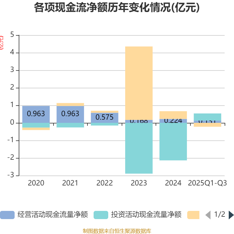 2025年前三季度,公司经营活动现金流净额为1314.43万元,同比增加1504.8万元;筹资活动现金流净额-2216.39万元,同比减少5652.75万元;投资活动现金流净额4045.16万元,上年同期为-1.38亿元。
