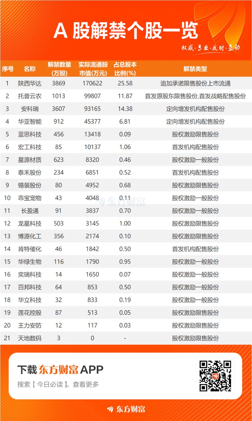 【明日解禁】明日21股解禁 陕西华达、托普云农解禁市值居前