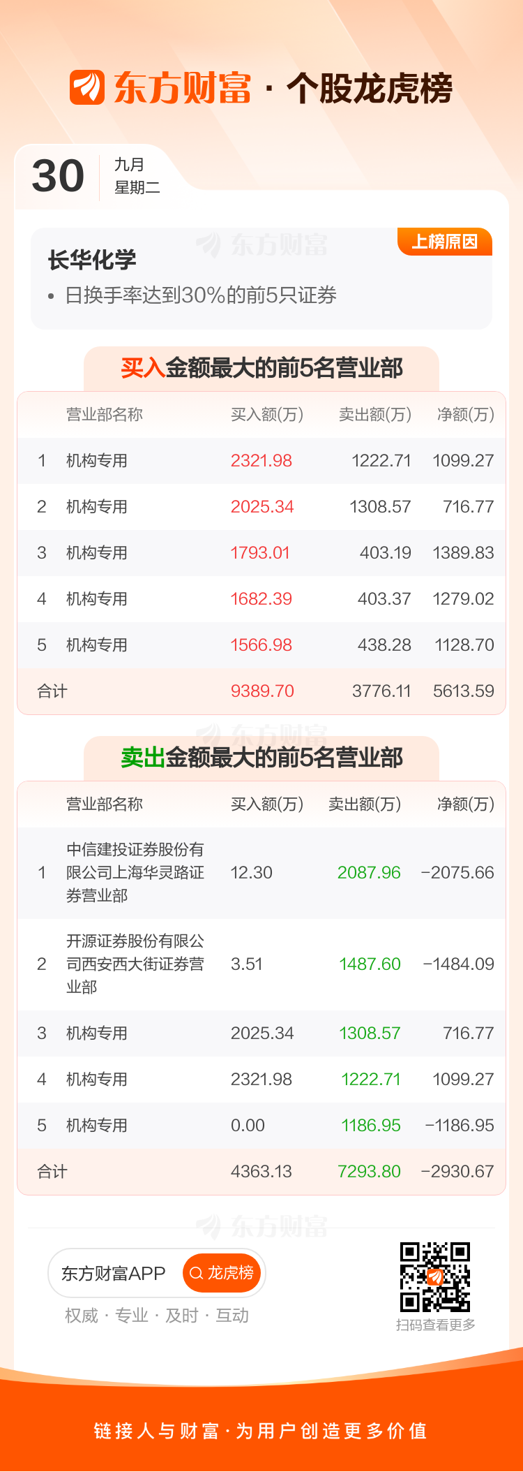 交易所2025年9月30日公布的交易公开信息显示,长华化学因成为日换手率达到30%的前5只证券上榜。长华化学当日收报37.65元,涨跌幅9.58%,偏离值33.51%,换手率33.51%,成交额6.87亿。