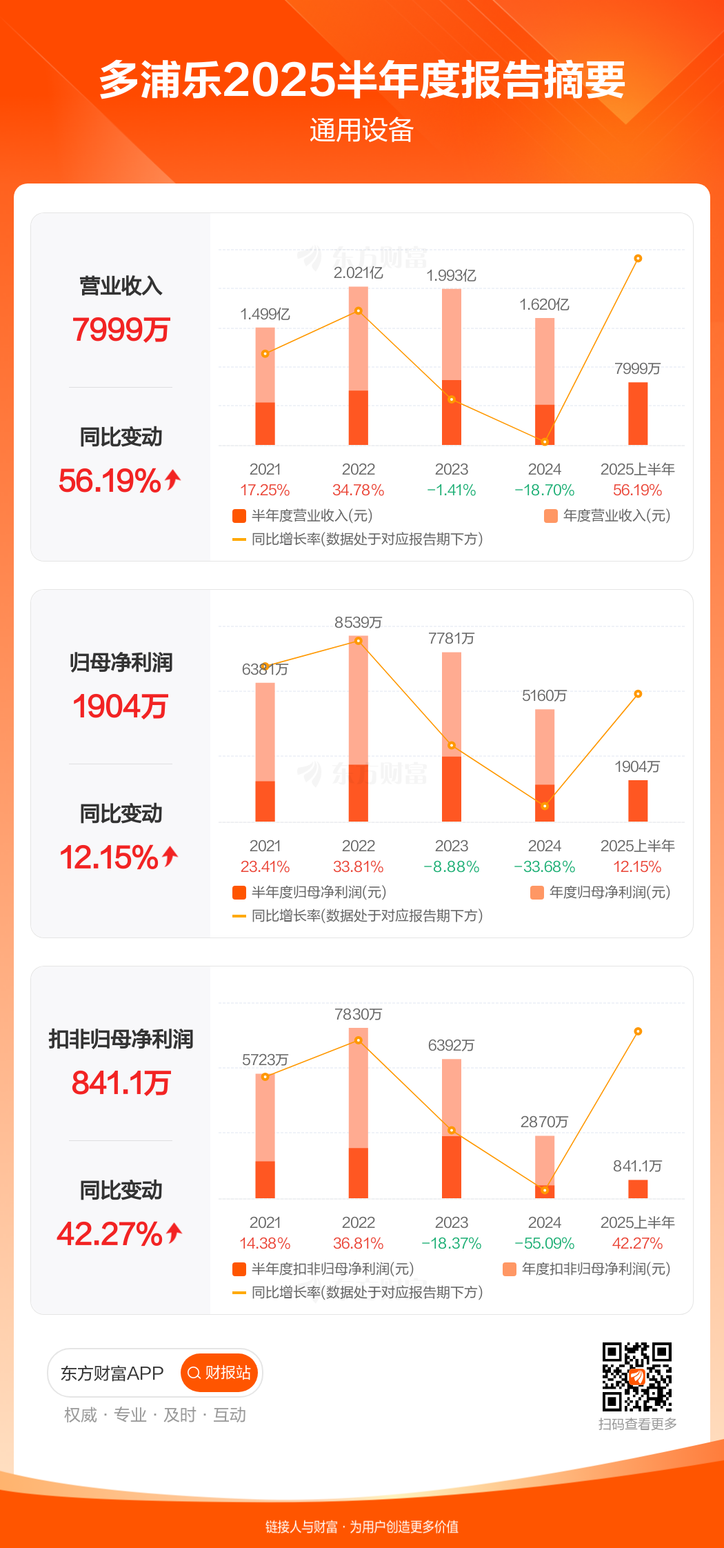 多浦乐发布2025半年度报告显示,公司上半年实现营业收入7998.51万元,同比增长56.19%;归母净利润1903.76万元,同比增长12.15%;扣非归母净利润841.09万元,同比增长42.27%。