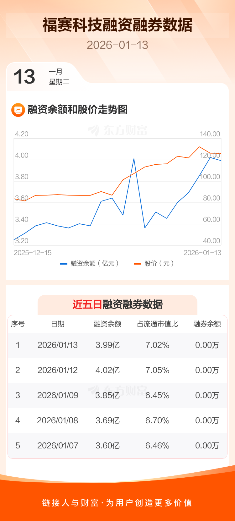 交易所最新数据显示,福赛科技于2026年1月13日获融资买入3430.79万元,融资偿还3676.48万元,当日融资净偿还245.69万元。目前,该股融资余额3.99亿,占流通市值比例为7.02%。
