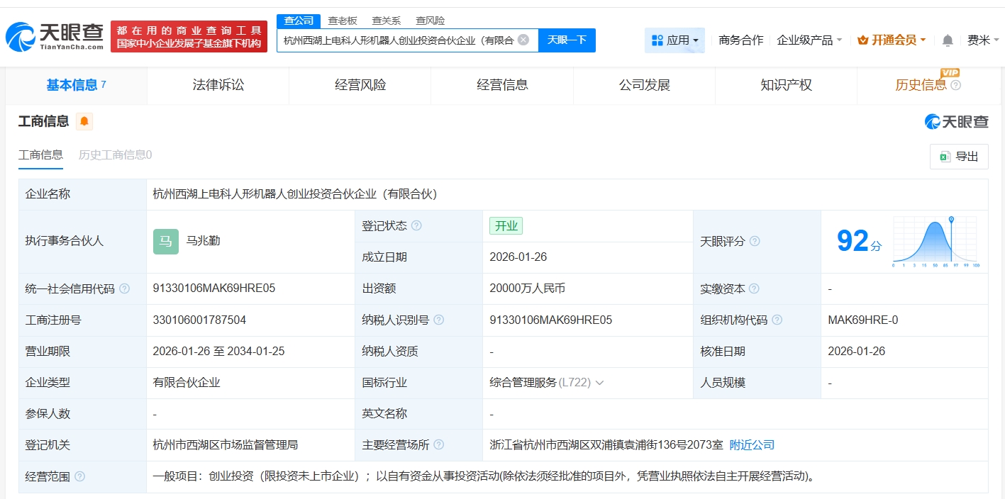 南方财经1月27日电,天眼查App显示,近日,杭州西湖上电科人形机器人创业投资合伙企业(有限合伙)成立,执行事务合伙人为马兆勤,出资额2亿人民币,经营范围为创业投资、以自有资金从事投资活动,由上海电器科学研究所(集团)有限公司、上海沿浦(605128)、兴瑞科技(002937)、福赛科技(301529)等共同出资。
