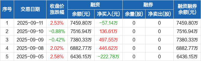 惠柏新材:融资净偿还57.14万元,融资余额7459.8万元(09-11)
