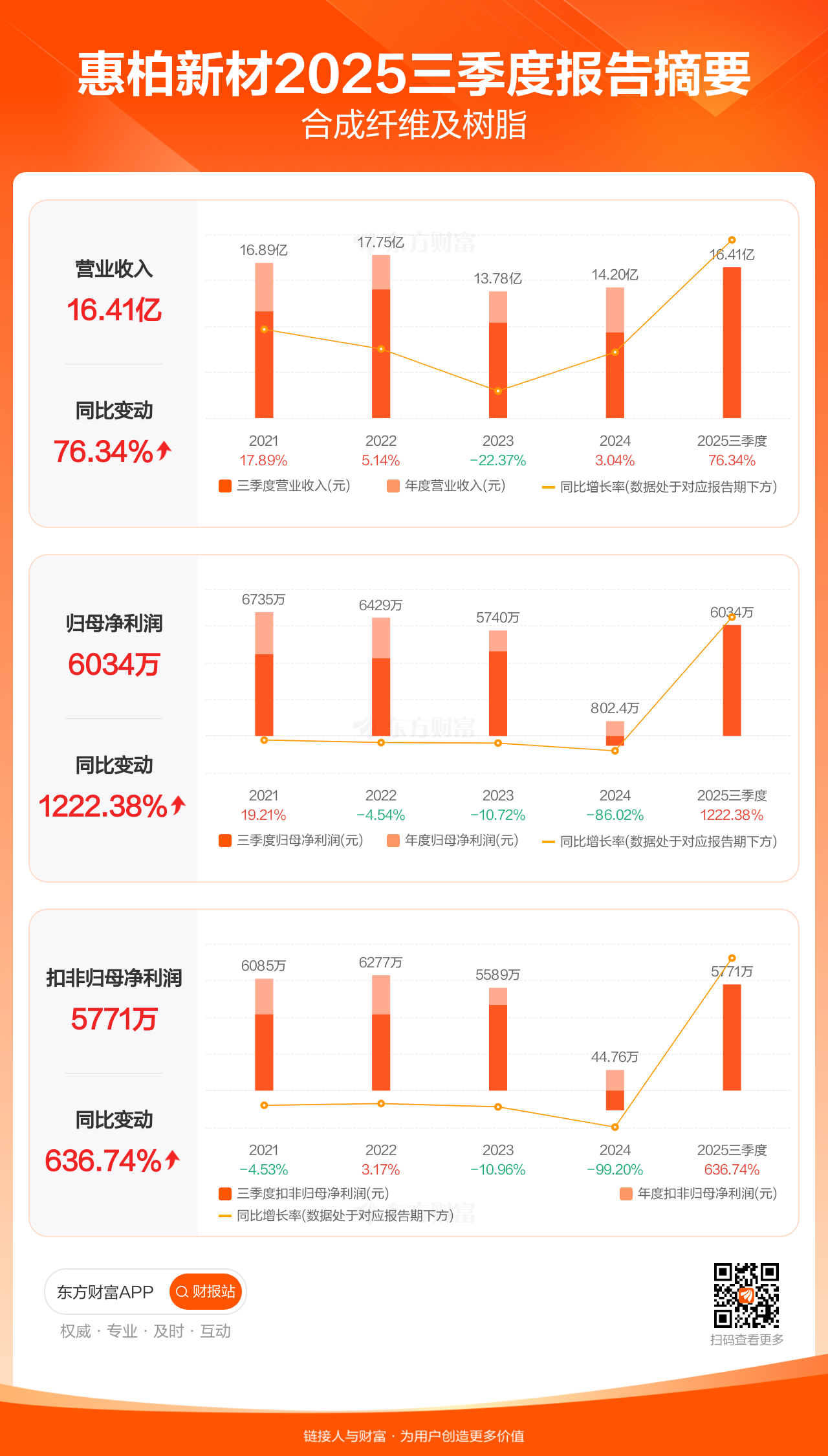 惠柏新材10月30日发布2025年三季报显示,公司前三季实现营业收入16.41亿元,同比增长76.34%;归母净利润6033.54万元,同比增长1222.38%;扣非归母净利润5771.01万元,同比增长636.74%。