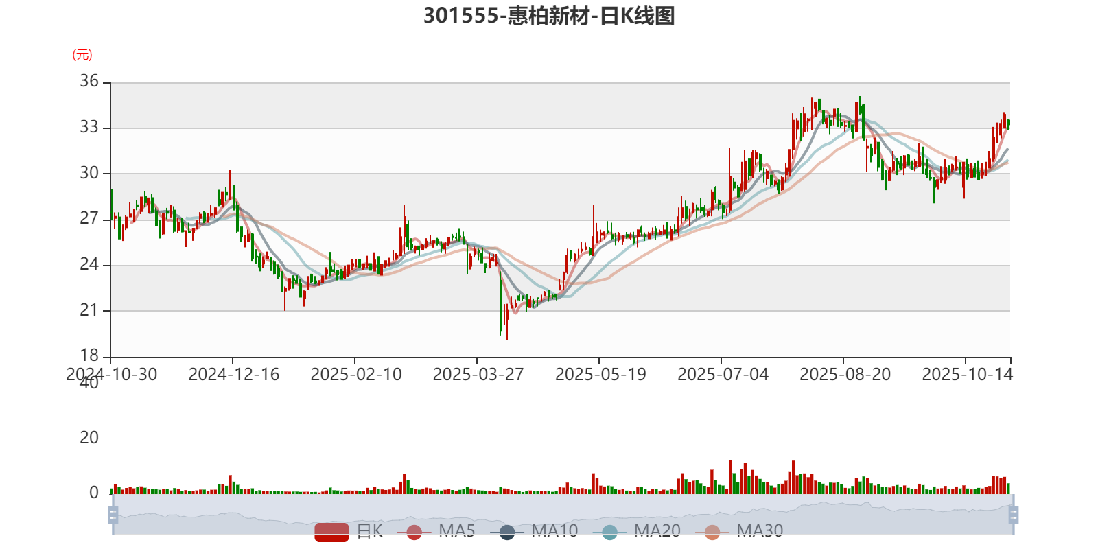 以10月29日收盘价计算,惠柏新材目前市盈率(TTM)约为41.59倍,市净率(LF)约2.73倍,市销率(TTM)约1.44倍。