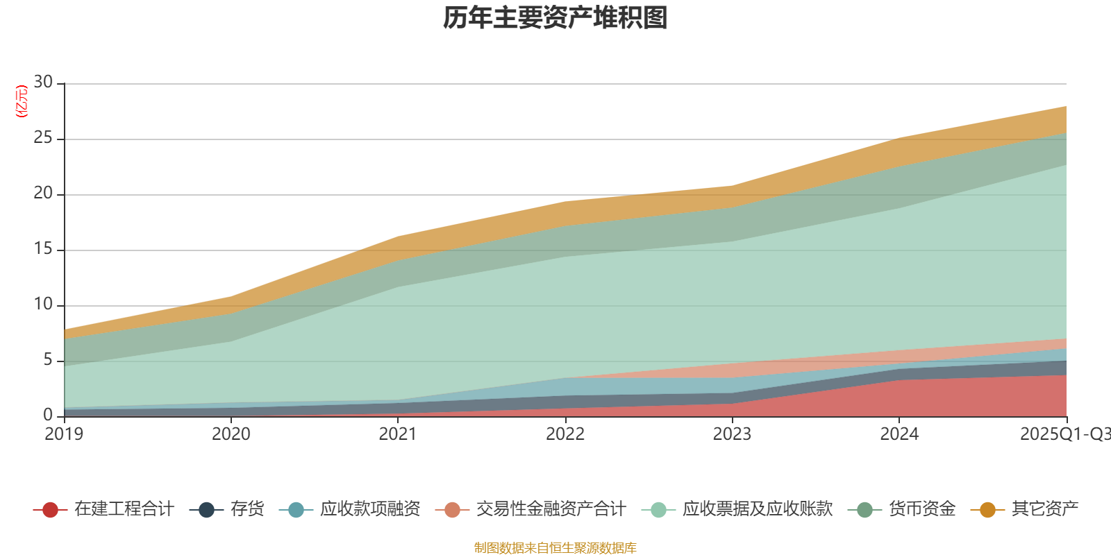 资产重大变化方面,截至2025年三季度末,公司应收票据及应收账款较上年末增加22.52%,占公司总资产比重上升5.08个百分点;货币资金较上年末减少23.24%,占公司总资产比重下降4.66个百分点;应收款项融资较上年末增加129.99%,占公司总资产比重上升2.04个百分点;交易性金融资产合计较上年末减少26.72%,占公司总资产比重下降1.65个百分点。