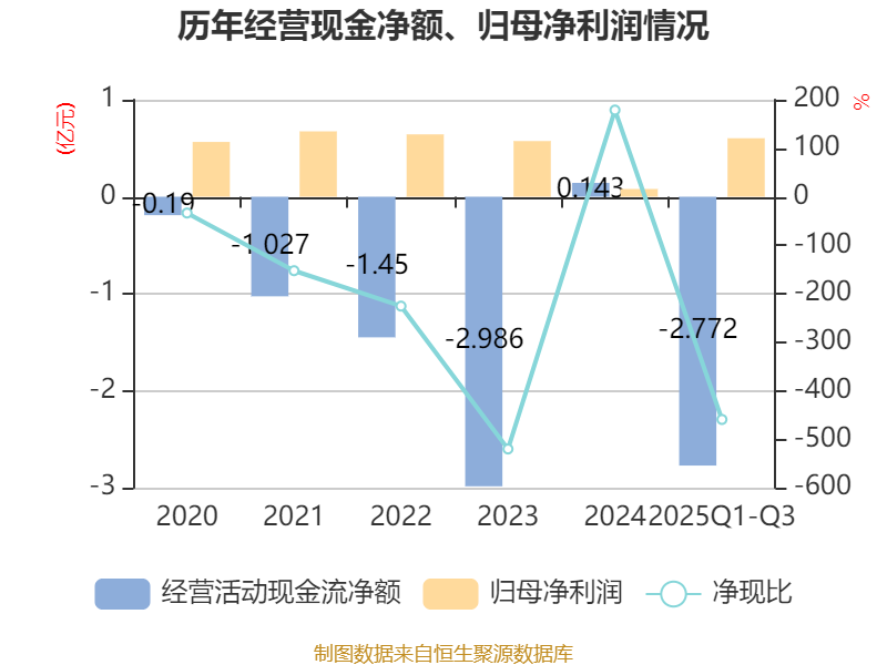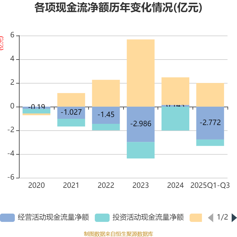 2025年前三季度,公司经营活动现金流净额为-2.77亿元,同比减少2.13亿元;筹资活动现金流净额2亿元,同比增加4297.01万元;投资活动现金流净额-5419.83万元,上年同期为-2.03亿元。