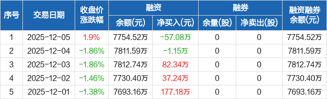惠柏新材:融资净偿还57.08万元,融资余额7754.52万元(12-05)