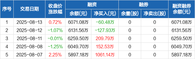 常友科技:融资净偿还60.48万元,融资余额6071.08万元(08-13)