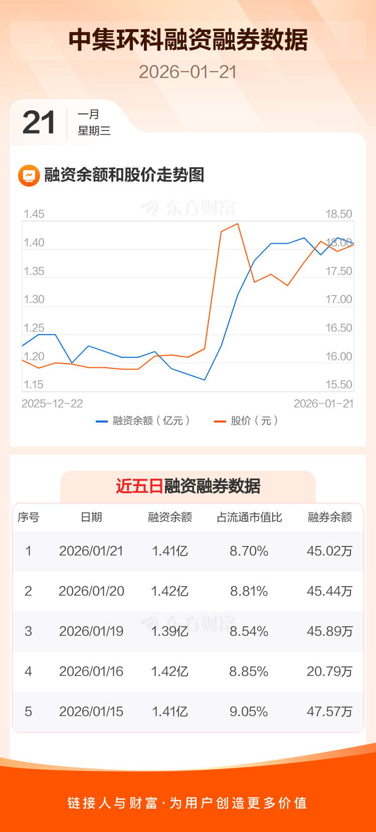交易所最新数据显示,中集环科于2026年1月21日获融资买入838.51万元,融资偿还931.63万元,当日融资净偿还93.12万元。目前,该股融资余额1.41亿,占流通市值比例为8.70%。