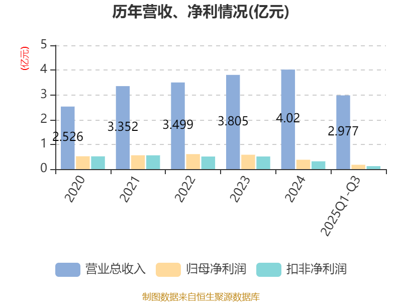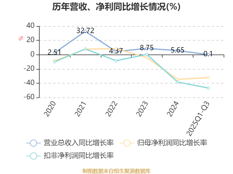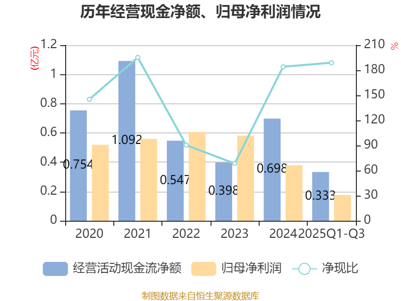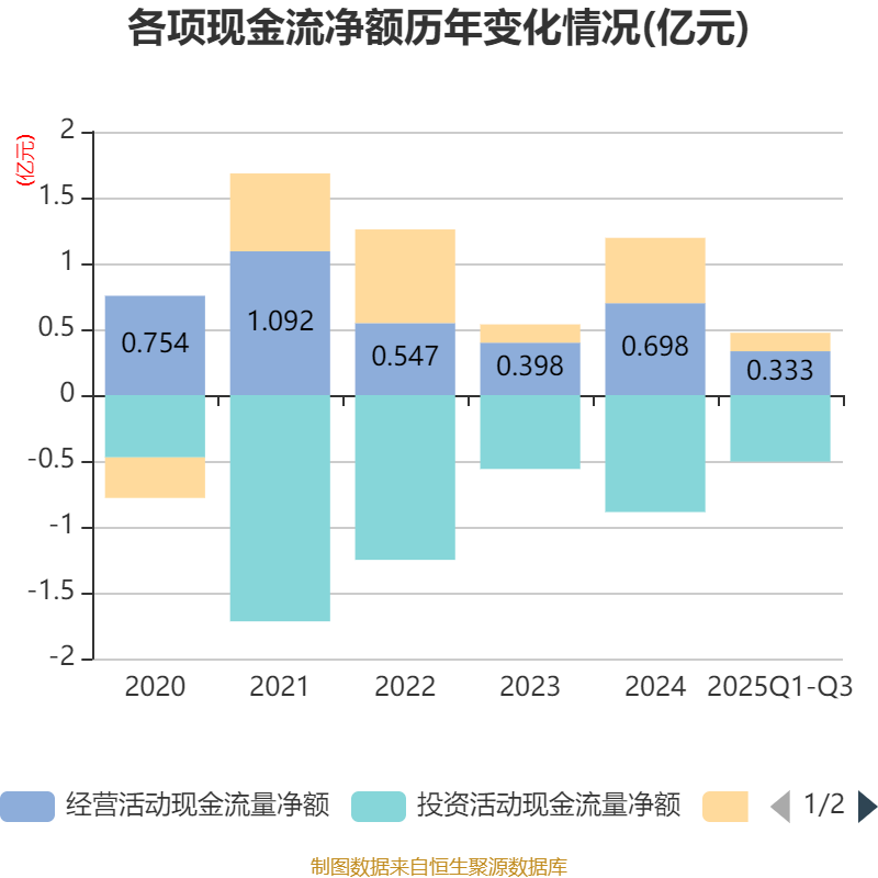 2025年前三季度,公司经营活动现金流净额为3332.67万元,同比下降43.23%;筹资活动现金流净额1398.9万元,同比减少2586.87万元;投资活动现金流净额-5049.86万元,上年同期为-9257.43万元。