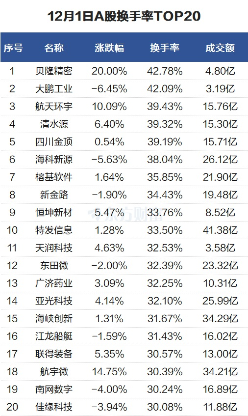 当天换手率最高的个股为贝隆精密,全天换手率42.78%。大鹏工业紧随其后,全天换手率42.09%。