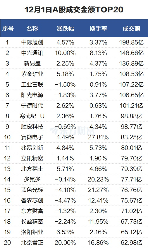 12月1日,上证指数涨0.65%,收报3914.01点;深证成指涨1.25%,收报13146.72点;创业板指涨1.31%,收报3092.5点。