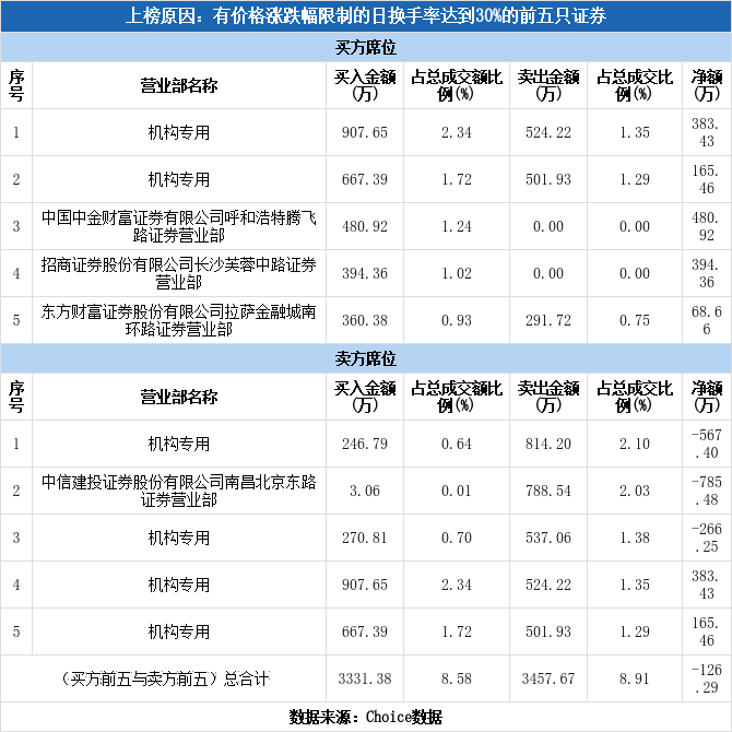 龙虎榜数据显示,今日共6个机构席位出现在龙虎榜单上,分别位列买一、买二、卖一、卖三、卖四、卖五,合计净卖出284.76万元,占龙虎榜净卖额的225.47%。除此之外还有航天发展、和而泰、初灵信息等31只个股榜单上出现了机构的身影,其中18家呈现机构净买入,获净买入最多的是和而泰,净买额为3.30亿元;13家呈现机构净卖出,其中遭净卖出最高的为航天发展,净卖额为3.64亿元。